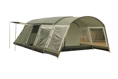 Grande tente familiale 6 places en polyester Oxford haute resistence. Armature en acier 22mm. Ouvertures latérales munies de contreporte moustiquaire. Aérations permanentes au toit, protegées par toit extérieur fixe. Tapis de sol integré (cousu au double toit) en polyester Oxford.