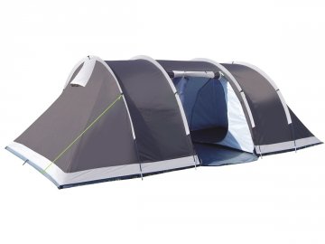 Polytex polyester 180 g/m². Tente tunnel avec séjour et 2 chambres séparées et opposées avec de la ventilation permanente.